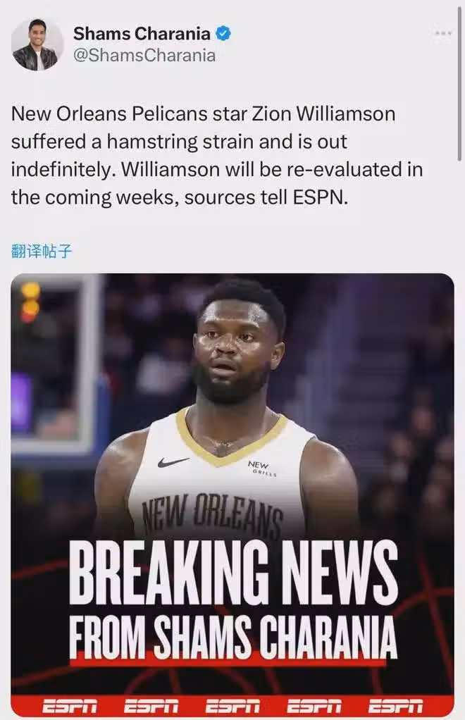Shams:胖虎腿筋拉傷,將無限期缺陣,將在未來幾周重新接受評估......