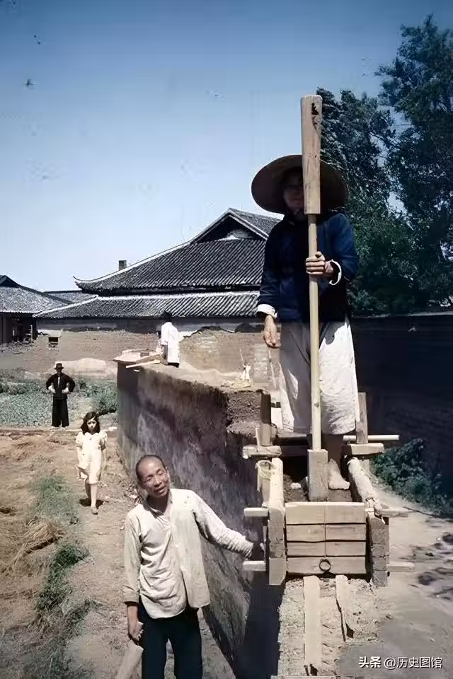 長沙的一座小鎮上,幾個當地人正在砌牆。他們砌牆的方式很特別,用的是夯築方法。木箱裡裝上黏土,用木棒將其砸緊實。一段一段地層層加築。這樣砌的土牆十分結實,經久耐用。