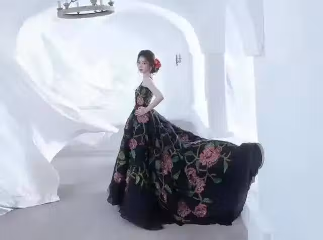 側邊玫瑰盤發髮型是整個造型的點睛之筆,玫瑰花的紅色與裙身上的花朵相互呼應,相互映襯,顯得熱情又張揚,這身妝造襯顯下的譚松韻,美得猶如世紀的貴族小姐,優雅十足。