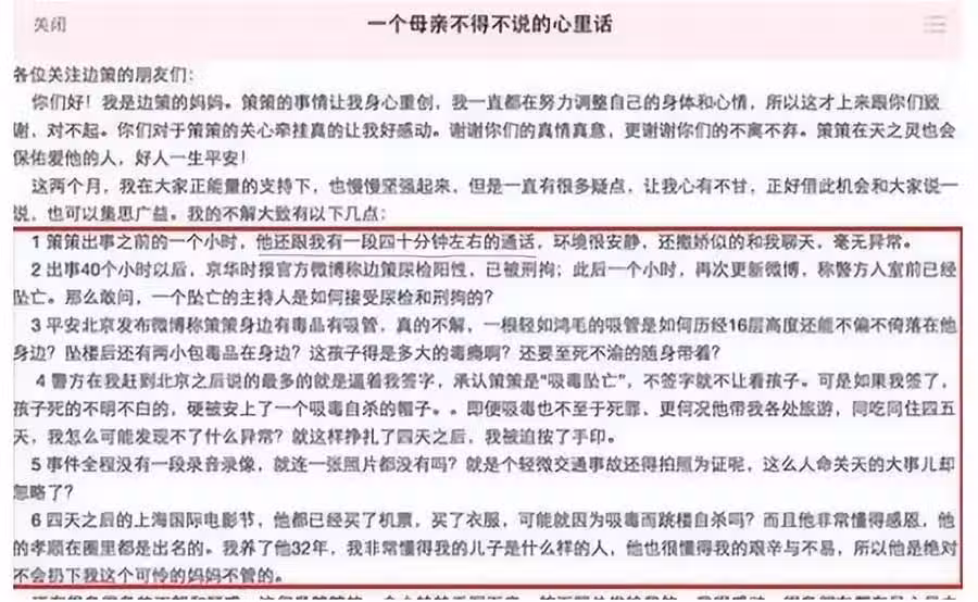 面對外界質疑,邊策母親連夜發文提問。