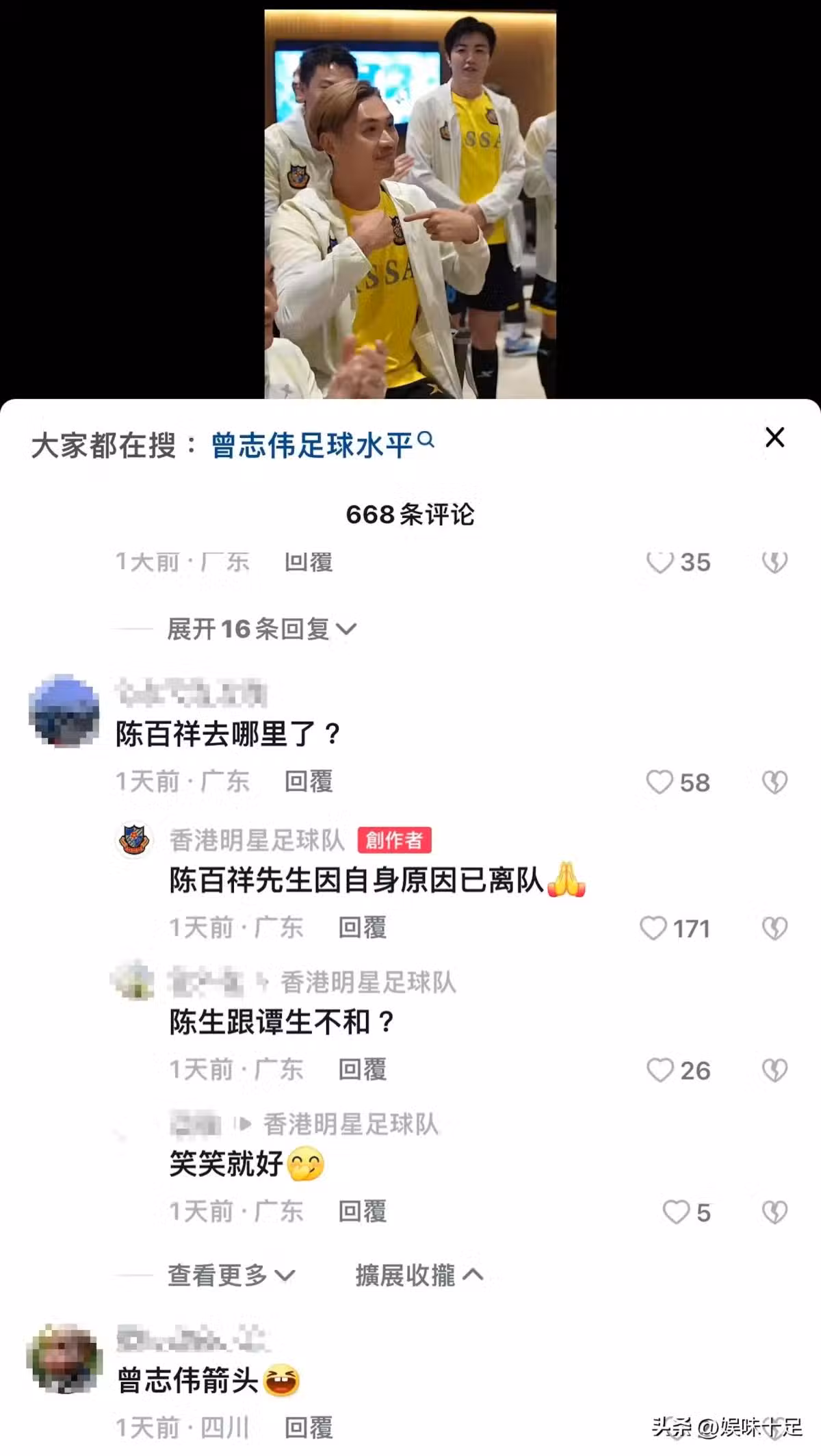 明星足球隊最近在內地的官方社交帳戶發布最新短片,視頻內容是隊長譚詠麟在點兵安排的片段。有網友就再次留言詢問陳百祥為何不再參加明星足球隊。該帳號回復稱:「陳百祥先生因自身原因已離隊」,然而對於不和傳聞並未直接回應,這一句話反而讓人對離隊原因產生更多聯想。
