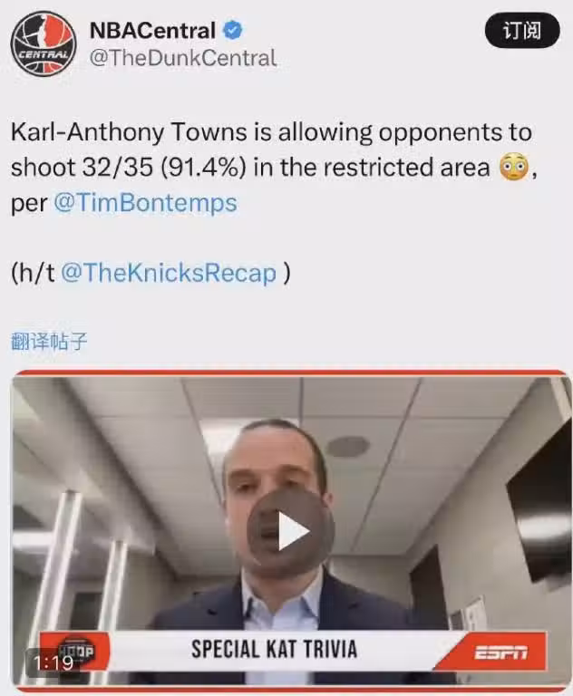 ESPN名記曬出了唐斯在防守端的數據,顯示他在場時,對手衝擊禁區的命中率竟然能高達恐怖的91.4%(35中32)......