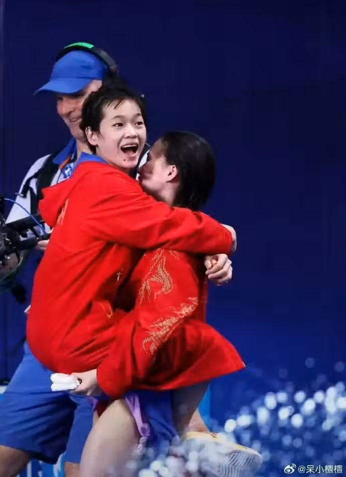賽後,兩位小姐妹在混合採訪區一起接受了媒體採訪,記者問她們奪冠的感受,全紅嬋表示,「拿到奧運會的雙人女子10米台金牌,非常開心吧,能夠和我的搭檔一起站上最高領獎台!」