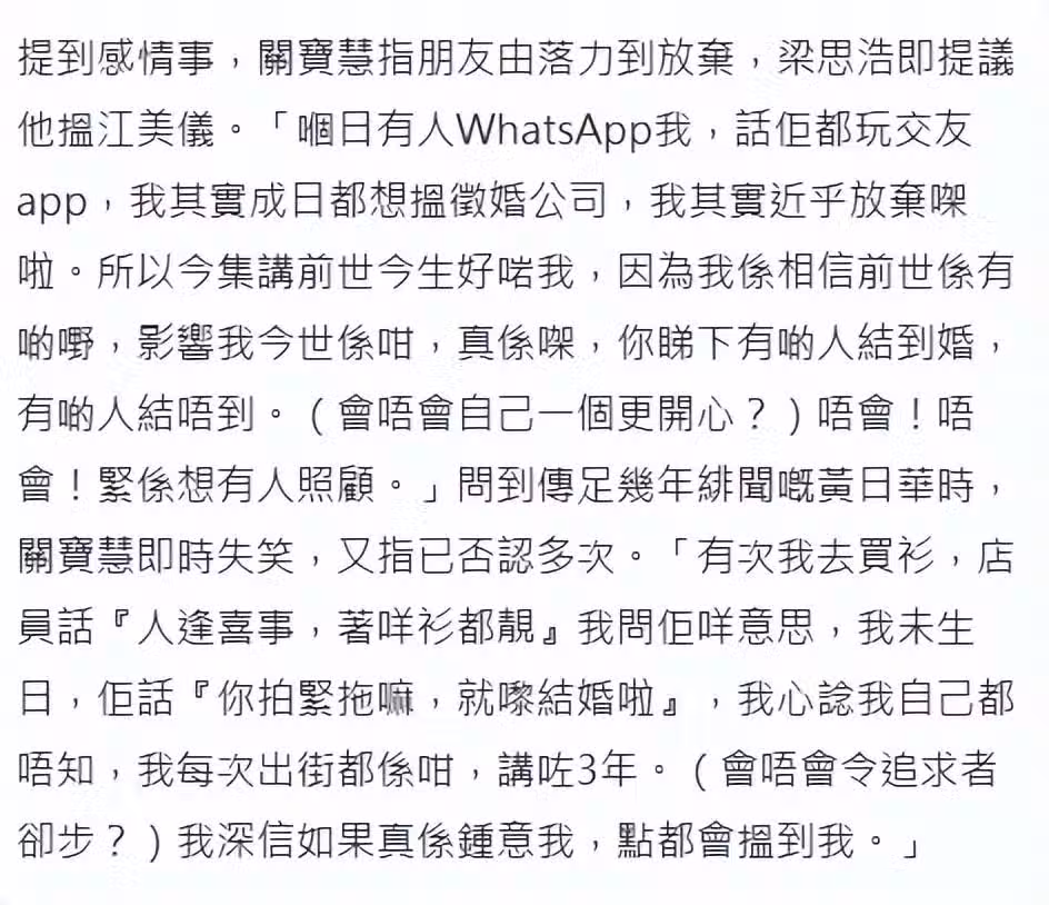 身邊朋友都出力幫忙介紹對象,江美儀還給她介紹了一款交友app,關寶慧坦言整天想找相親公司,但現在朋友近乎放棄了,只能安慰自己,有的人一輩子都結不了婚。
