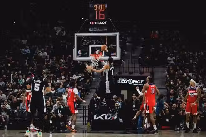 末節4分44秒,文班亞馬只能重新登場。普爾一直沒放棄,個人得分也來到40+!最後37.8秒,普爾和保羅爭奪球權發生口角。馬刺沒有再犯錯,全場結束,馬刺139比130戰勝奇才。普爾22投15中,高效率砍下42分6助攻。
