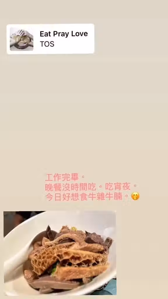 鄭秀文上載在家中吃宵夜的影片,並留言指:「工作完畢,晚餐沒時間吃,吃宵夜。今天好想吃牛雜牛腩。」鄭秀文將手機放在桌上,拍攝吃東西的畫面,更聽到畫外音有許志安的聲音。