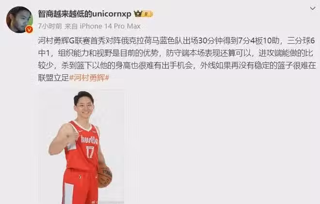 季前賽河村勇輝的三分命中率也僅僅25%,投籃命中率更是低至21.1%,場均出戰15.2分鐘得到3.4板0.2板4.2助1.6失誤,目前為止披掛上陣的常規賽則是場均亮相3.3分鐘拿下1分0.3板0.8助,兩項命中率18.2%與12.5%。