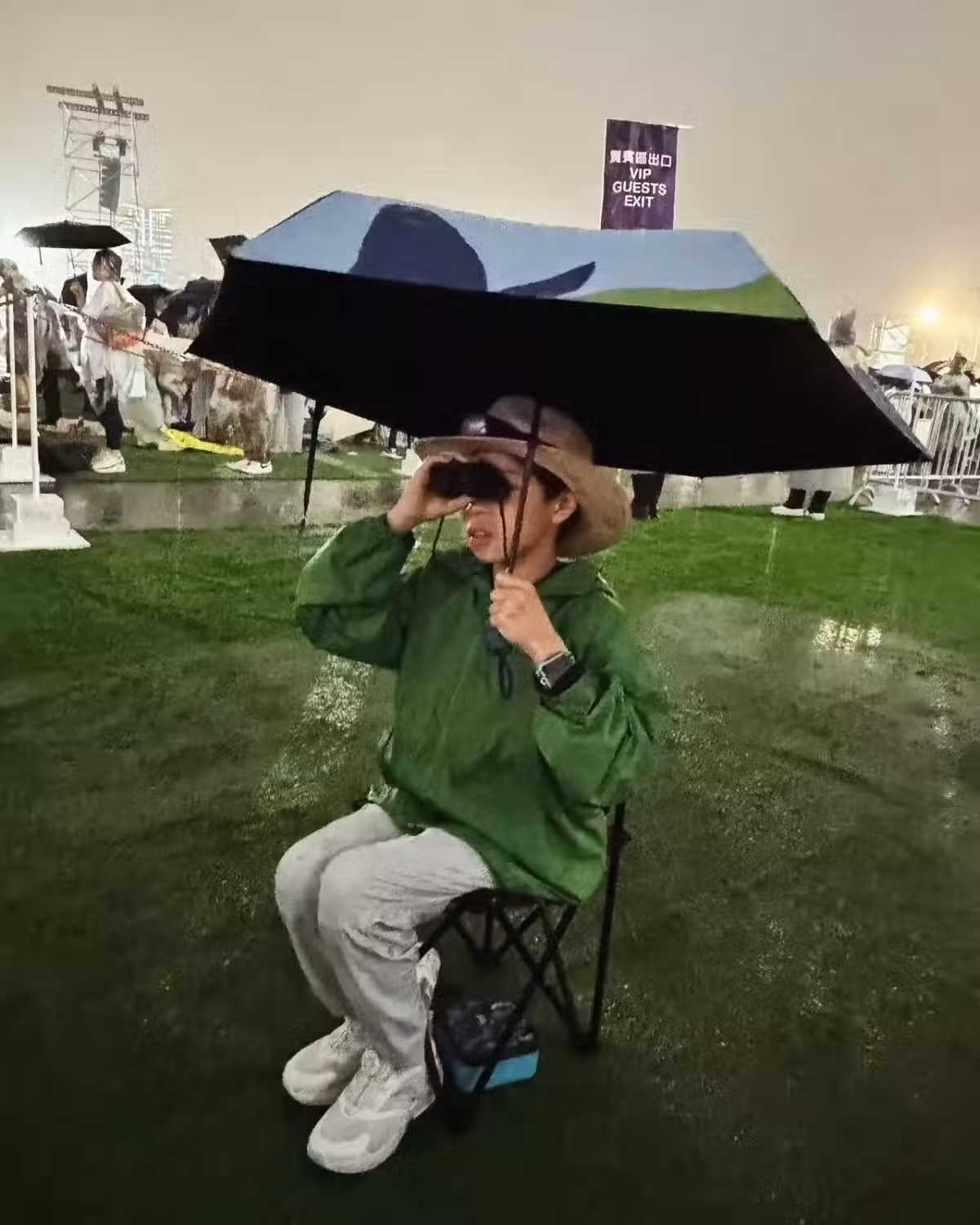 另外一張照片是霍中曦拿著望遠鏡觀看音樂會的照片,綠色風衣與場地綠草坪完美匹配,話說11歲的他越來越帥氣了。