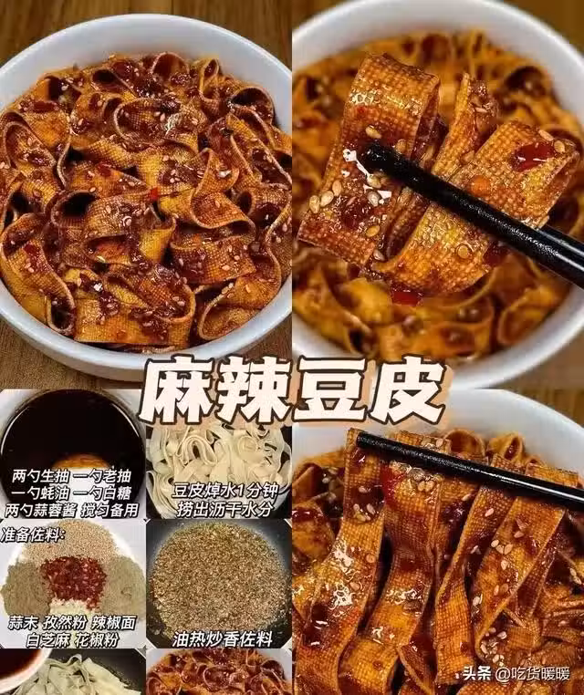兩勺生抽一勺老抽一勺蚝油 一勺白糖 豆皮焯水1分鐘 兩勺蒜蓉醬 攪勻備用 撈出瀝干水分 準備佐料:蒜末孜然粉辣椒麵白芝麻花椒粉 油熱炒香佐料 倒入入豆皮醬汁 翻炒均勻即可 裝盤開吃!香!