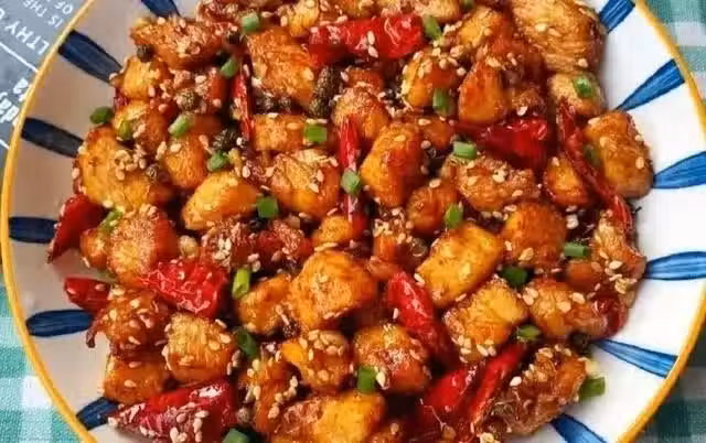 4、另起鍋燒油,準備好的香料煸炒,再加入干辣椒炒出辣味,倒入炸好的雞塊翻炒均勻,加半勺料酒,少許鹽,半勺生抽調味,最後撒上適量熟白芝麻即可。