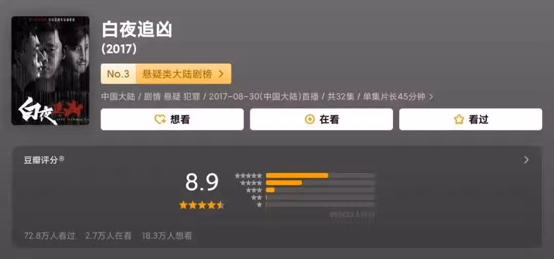 最終收官,《白夜追兇》拿下了豆瓣8.9的高分,不僅憑一己之力,讓疲軟已久的懸疑劇市場,重新煥發生機。