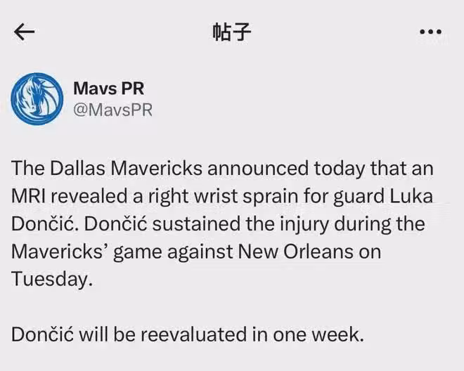 東契奇,右手腕扭傷,一周後重新接受評估。