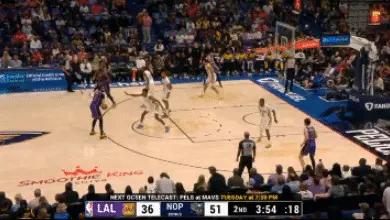 接到濃眉傳球,里夫斯一個簡單變向有效吸引2名鵜鶘球員防守注意力,從而為濃眉的順下創造空間。