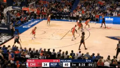 不同於剛才的回合,在未藉助隊友任何掩護後拉文迎著鵜鶘防守球員完成後撤步三分。