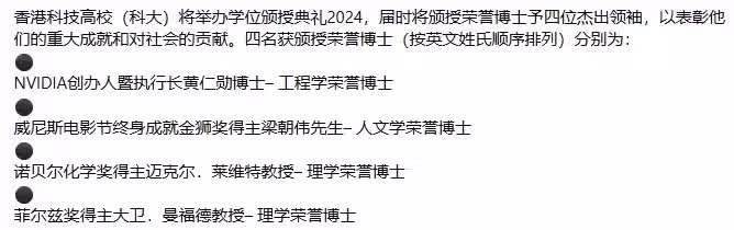 梁朝偉頒授的是「人文學榮譽博士」,黃仁勛則是「工程學榮譽博士」,大衛.曼福德和麥可.萊維特兩位科學家獲得「理學榮譽博士」。