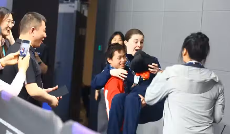 在頒獎儀式結束後,感人的一幕發生了。獲得銅牌的英國選手Andrea Spendolini Sister走向了全紅嬋,兩位運動員熱情相擁,彼此之間的尊重和友誼超越了國籍和比賽的勝負。全紅嬋更是以一種充滿力量和友好的方式,將斯潘多里尼「公主抱」起來,這一溫馨的畫面被在場的攝影師捕捉下來,成為了此次比賽的經典瞬間。