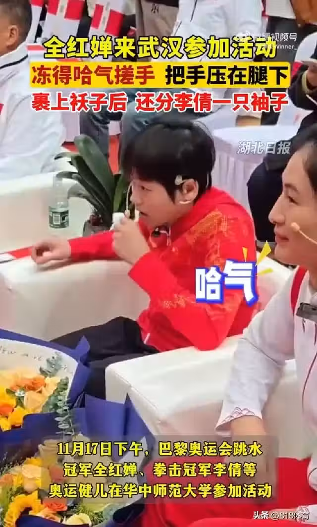 可愛!武漢降溫全紅嬋凍得哈氣搓手裹棉襖分,拳擊冠軍李倩一隻袖子
