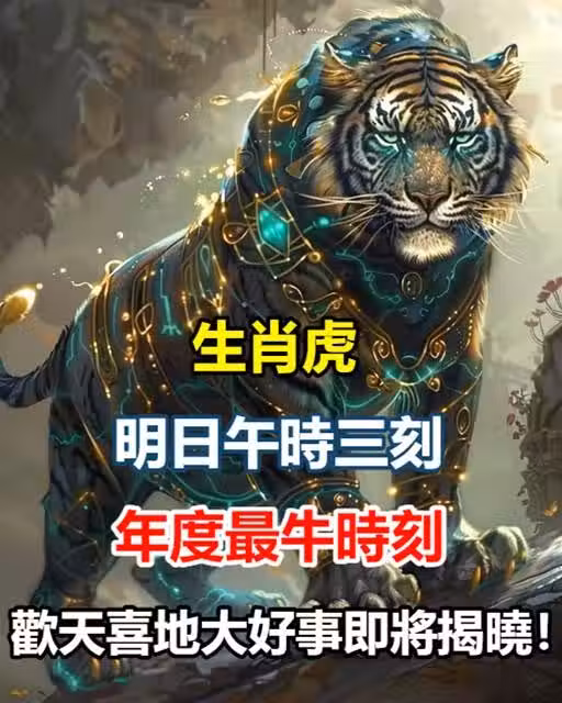 古語有云,生肖之中,虎乃百獸之王,象徵著力量、勇氣與無畏。 當時間的指針悄然指向明日午時三刻,一個關於生肖虎的年度最牛時刻,如同璀璨星辰般,在浩瀚的天際中悄然醞釀,即將照亮每一個屬虎人的心房,帶來一場歡天喜地的盛大慶典。
