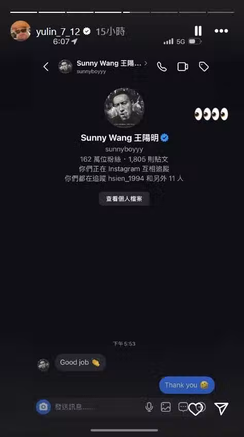 藝人王陽明傳訊息對他說做得好加上拍手的表情符號,林昱珉則回復謝謝。(圖/翻攝自林昱珉IG)