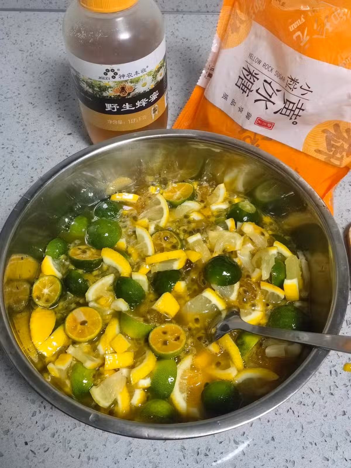 6.把上面三樣倒入盆中,加入黃冰糖、蜂蜜,再拌均勻