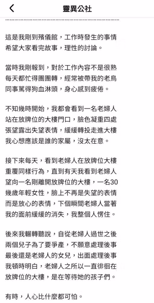 一名網友在臉書社團「靈異公社」發文回憶,剛到殯儀館工作,對工作內容不是很熟悉,經常被老鳥罵得臭頭,身心感到疲倦,有次他撞見一名老婦人站在放牌位的大樓門口,臉色相當凝重、四處張望露出失望表情,接著轉頭離去,起初他以為是家屬,沒想到這名老婦人天天重複同樣的動作。