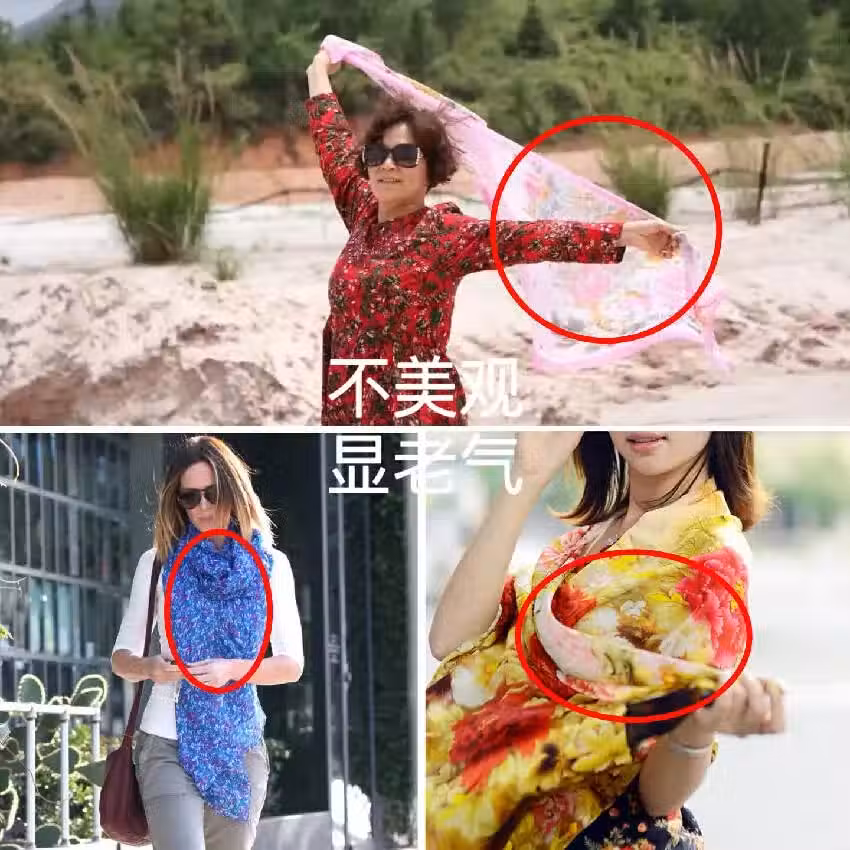 絲巾應該是每一個中年女人老了選擇的必選單品了,它豐富的造型配色圖案吸引著女性的購物慾望,可就是這麼一些花花綠綠的色彩,讓中年女人在佩戴的時候亂了陣腳,披著艷麗的大花絲巾出門,給人一種大媽的即視感;