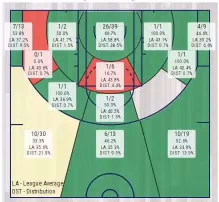 如圖所示,除左側45度角外其餘4個三分區域的命中率上克內克特都遠優於聯盟均值。事實上,即便放眼半場14個區域中也僅有罰球線、左側肘區的投籃率低於聯盟均值。換個角度看,克內克特的投射能力足夠優秀。