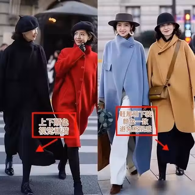 如果一身色彩相近,不想有明顯的分層,那麼可以通過小面積使用亮色來點綴,比如圍巾、鞋子、包包、腰帶等配飾,完全和主基調形成反差,也不會剝離整體。