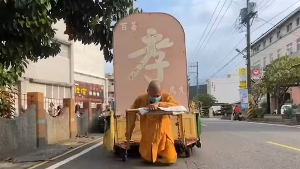 儒家思想中,「百善孝為先」是非常重要的觀念,提醒子女們要孝順父母。住在屏東市區的民眾,時常會在街道上看見一名身穿袈裟的出家人,拉著一台寫著大大「孝」字的棺材車,用跪姿慢慢前進,原來這位師父為了告誡世人要孝順,同時為過世的父親盡孝,發願要跪行1萬公里,現在已經快達到目標。