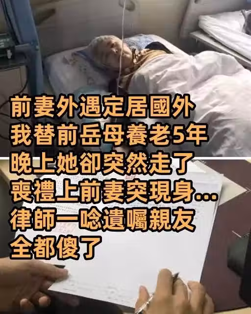 前妻外遇定居國外,我替前岳母養老5年,晚上她卻突然走了,喪禮上前妻突現身…律師一念遺囑親友全都傻了