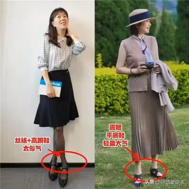 不信的話就看看這些搭配對比,即便是身材維持得很好的中年女人,精心的穿裙子搭配絲襪和高跟鞋也有可能給人一種廉價感,而不穿絲襪和高跟鞋,既舒適還優雅,穩妥得多!