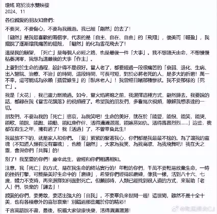 子女通過社交平台公布瓊瑤遺書,她希望大家不要哭、傷心和難過,她已經「翩然」的去了。