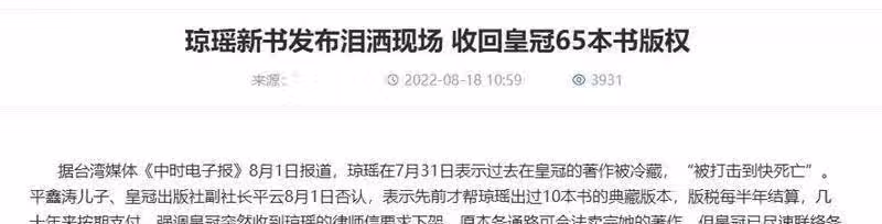 2017年,在跟繼子繼女的糾葛後,瓊瑤收回了皇冠文化65部作品的著作權。