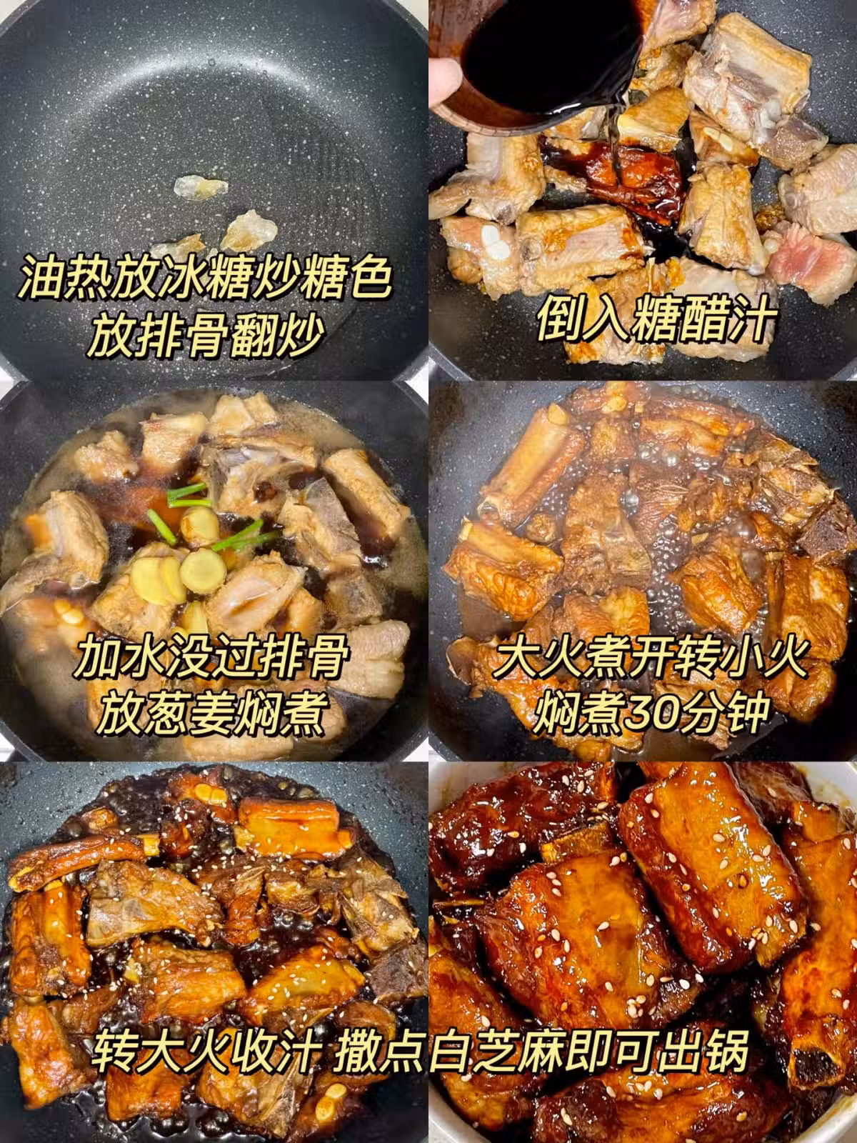 2️⃣排骨冷水下鍋,加蔥段、薑片焯水撈出,鍋里熱油放冰糖炒至糖色,倒入排骨翻炒,加入糖醋汁,加熱水沒過排骨放蔥姜燜煮半小時,轉大火收汁,撒上白芝麻即可