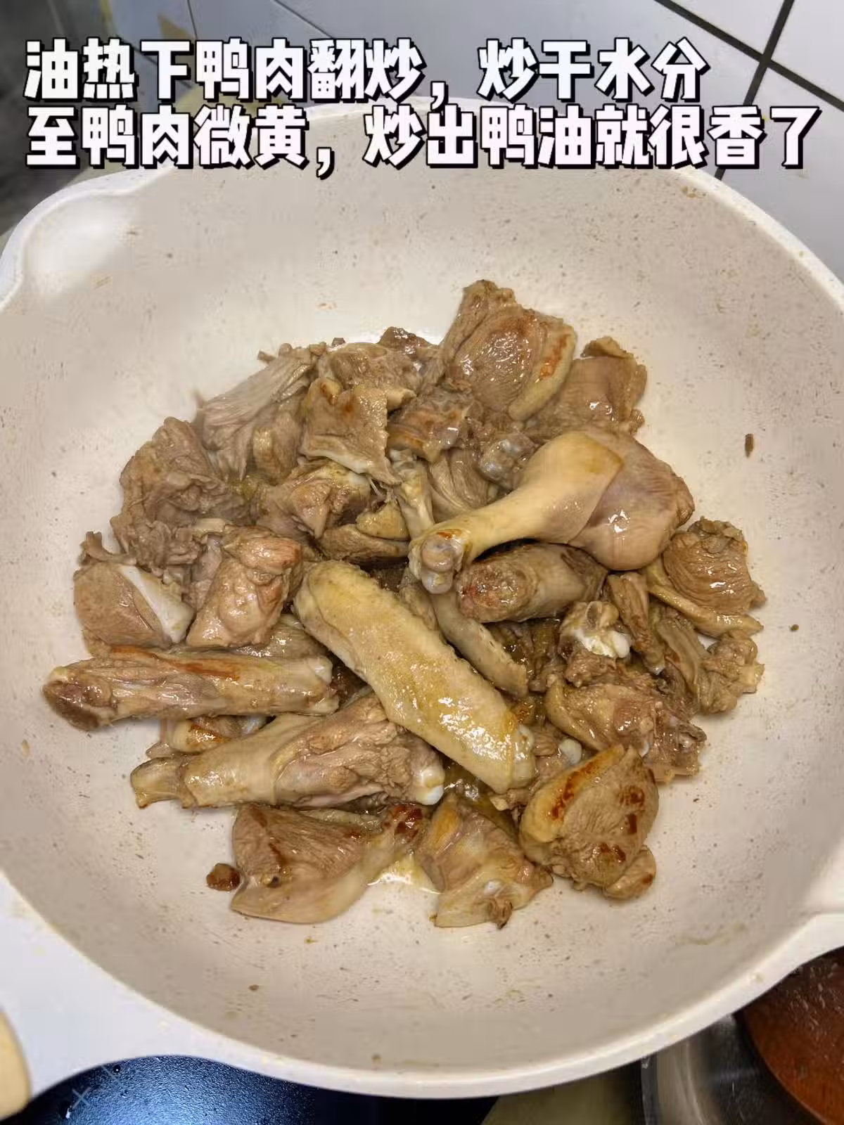 ① 油熱下鴨肉翻炒,炒干水分至鴨肉微黃,炒出鴨油就很香了