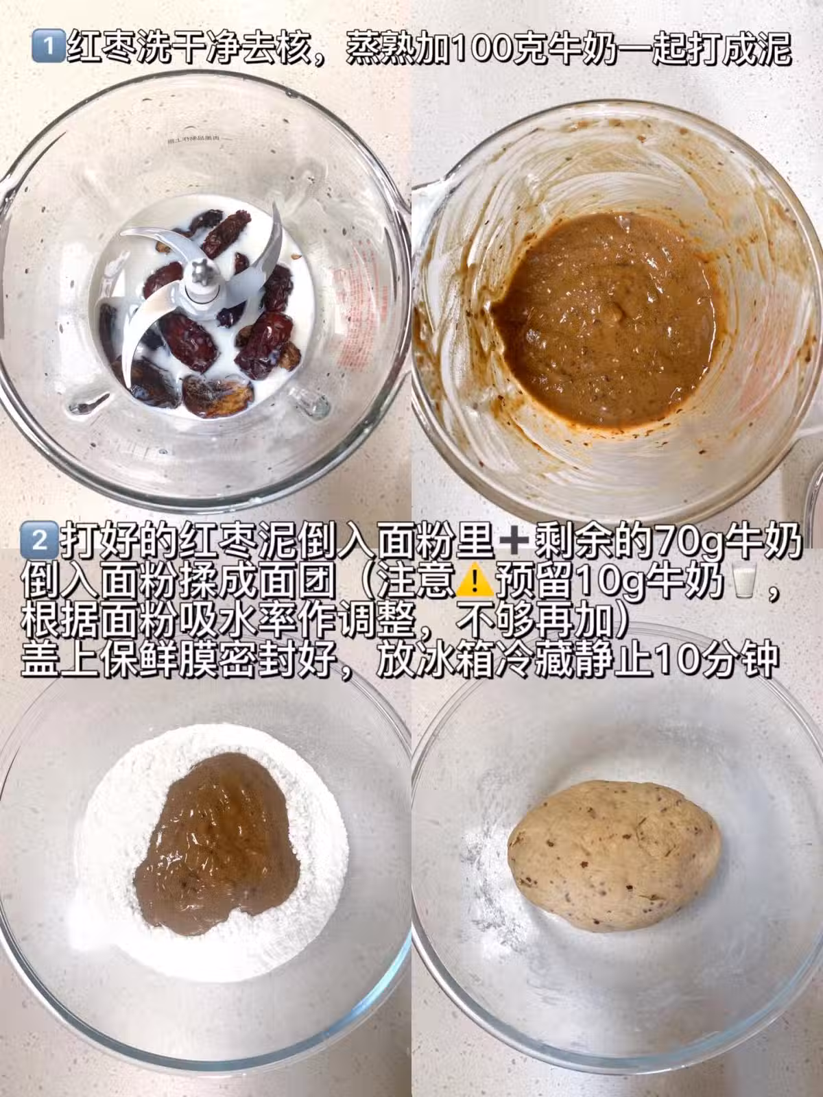 1⃣️紅棗洗乾淨去核,蒸熟加100克牛奶一起打成泥