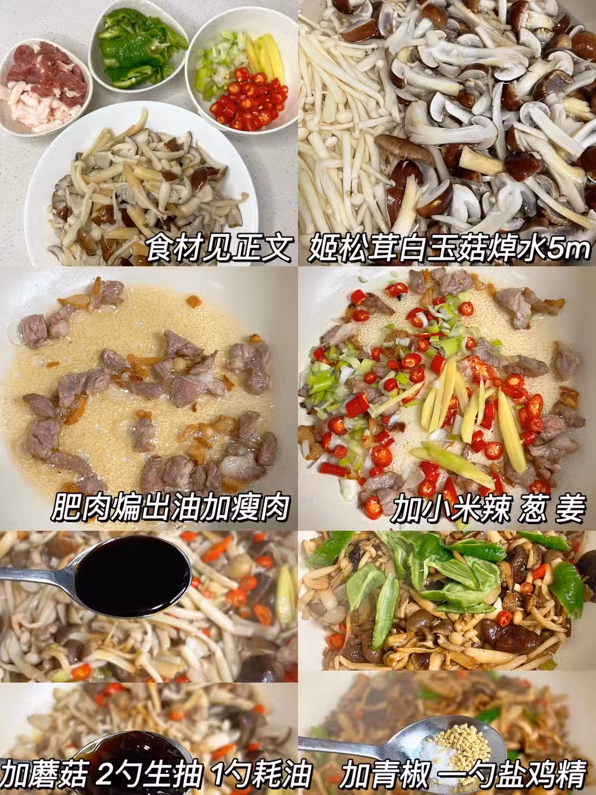 🥗食材:姬松茸、白玉菇、五花肉、青椒、姜、大蔥、小米辣