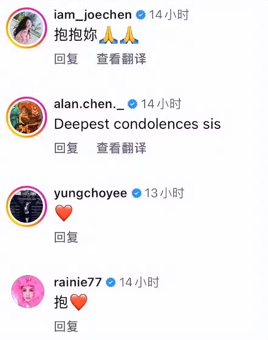 陳妍希公開爸爸去世的消息後,圈內好友陳喬恩、楊丞琳紛紛擁抱給予安慰,陳喬恩老公也在下面留言:「最深切的哀悼」。