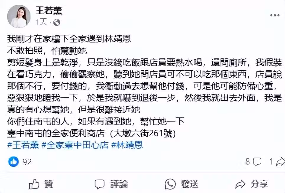 據台媒12月8日報道,台灣名人王若薰發文爆料,她在樓下的商店看到林靖恩,對方沒錢吃飯跟店員討要熱水和上廁所,期間還乞討食物吃,遭到店員拒絕。王若薰想提供幫助,卻被林靖恩惡狠狠盯了一眼,似乎很怕外人接近。