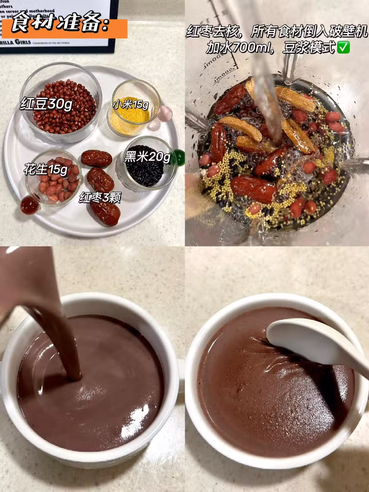 ✔️做法:食材洗凈,紅棗去核,所有食材倒入破壁機,加入清水700ml。豆漿模式✅