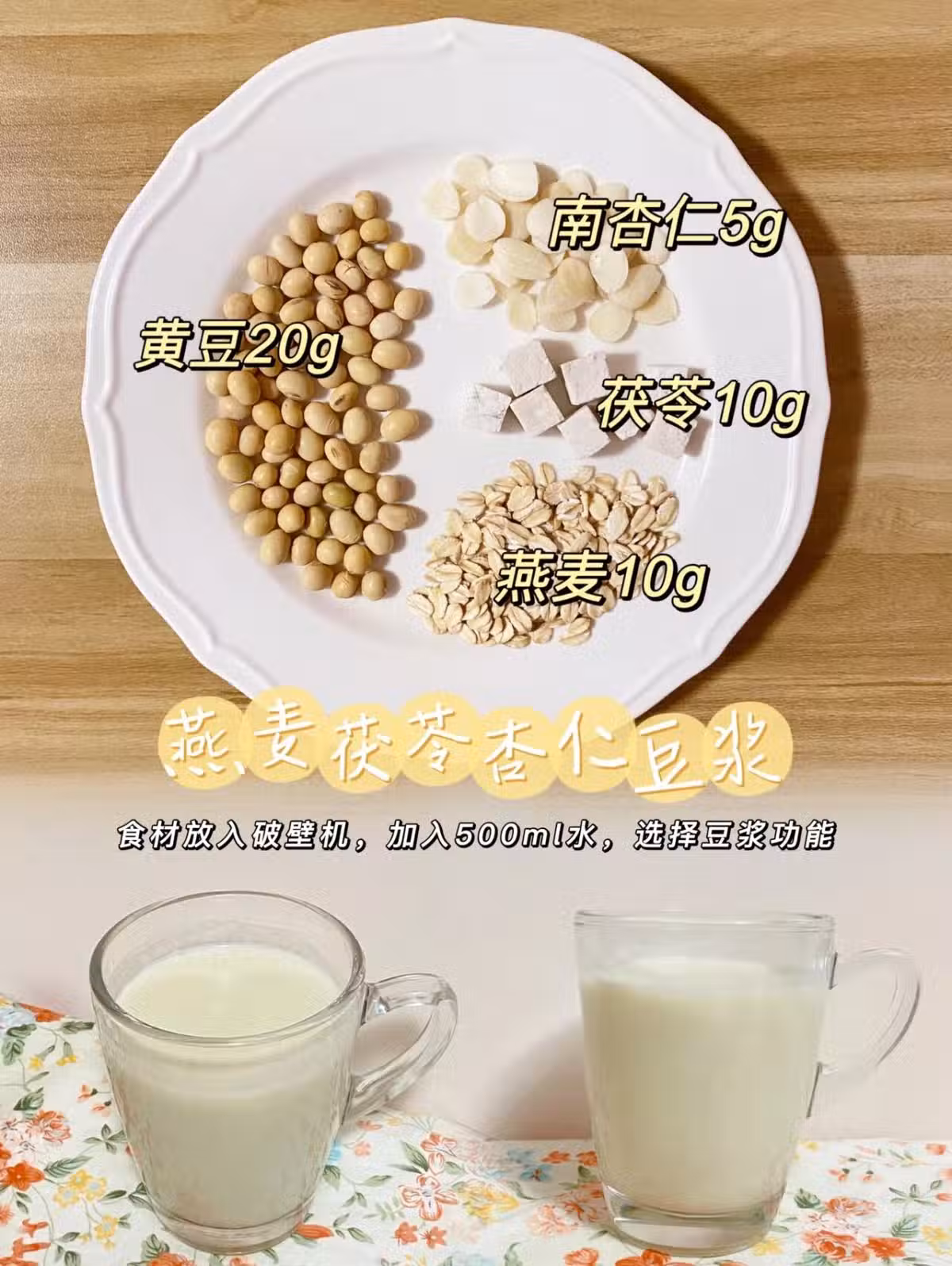 黃豆20g 十南杏仁5g 十茯苓10g 十燕麥片 10g+500ml清水