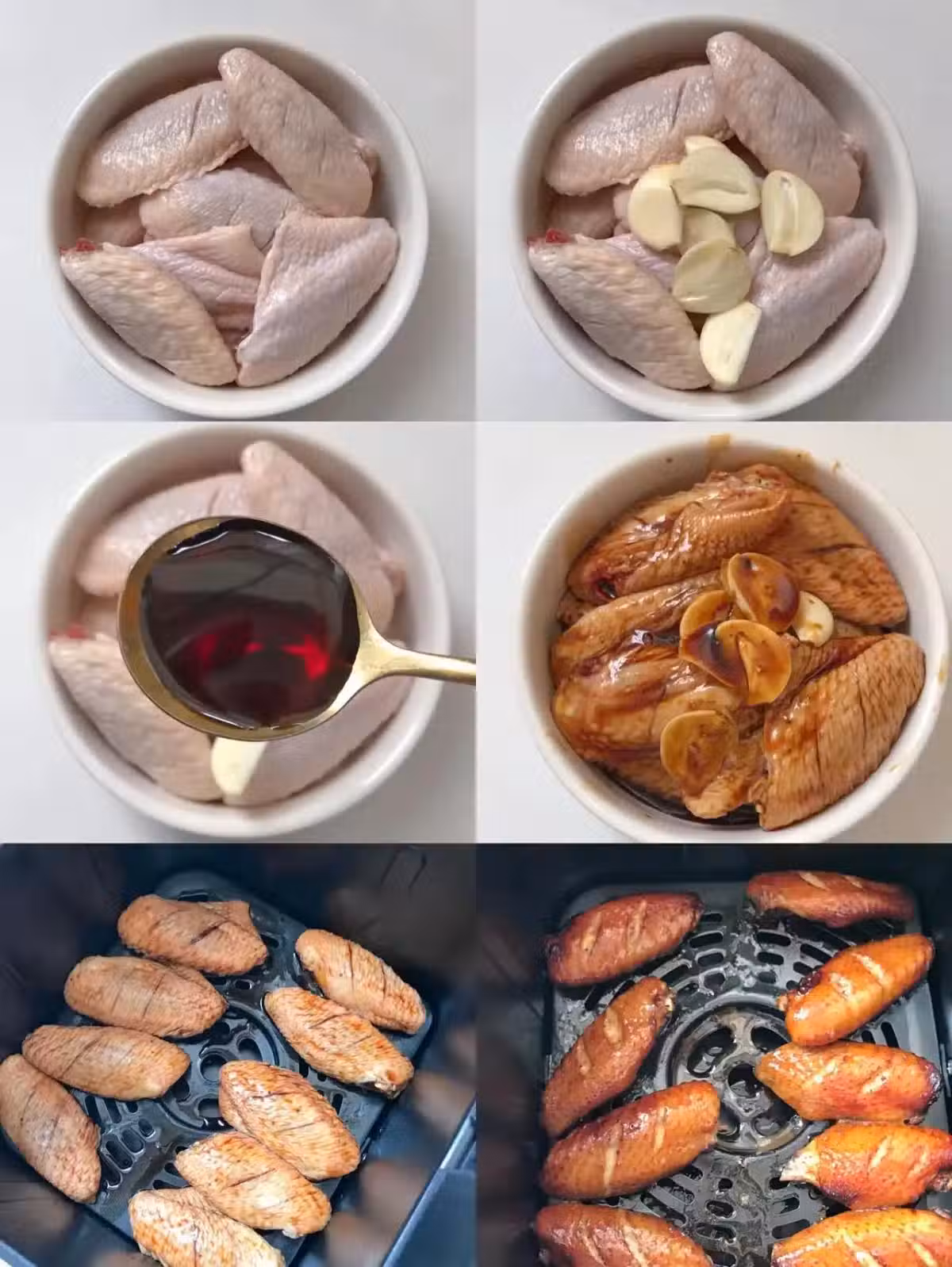 2、腌好的雞中翅放入烤架上,放入空氣炸鍋180度烤20分鐘(中間可以抽出看看上色程度,可以適當蓋錫紙)