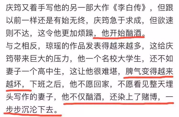 眼看著瓊瑤的名氣越來越大,而另一邊的慶筠事業上依舊是毫無起色,因為事事不得志,慶筠開始喝酒,甚至還沾染上了賭博,一步步沉淪下去。