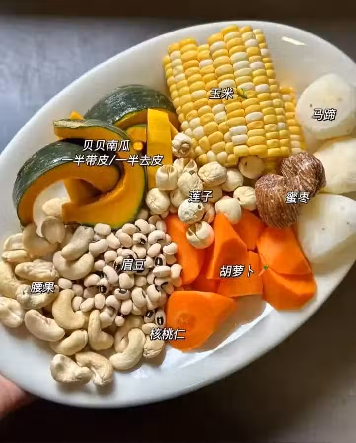 馬蹄/眉豆/蓮子/腰果/玉米/南瓜/胡蘿蔔/蜜棗
