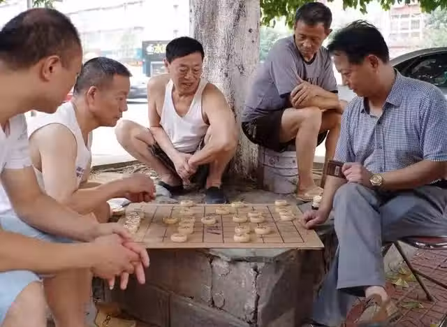 社區花園坐滿了悠閒的老人們,他們有的在下棋、有的在聊天,還有的在餵鴿子。