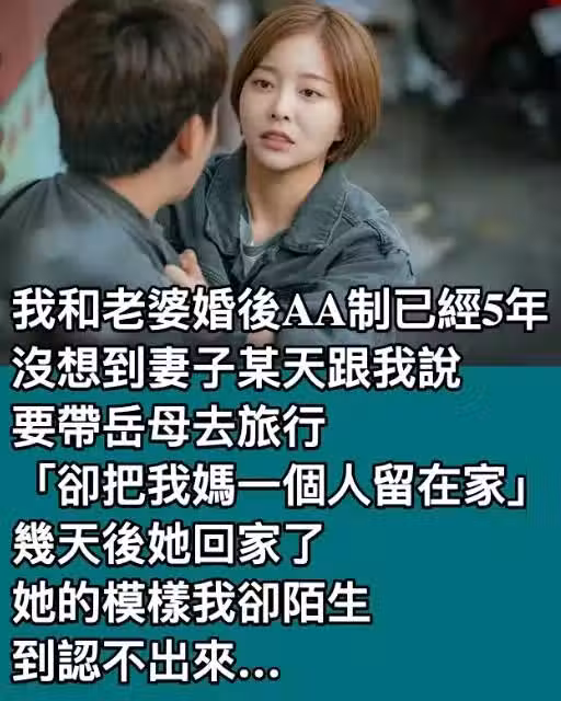 我和老婆婚後AA制已經5年,沒想到妻子某天跟我說,要帶岳母去旅行「卻把我媽一個人留在家」,幾天後她回家了,她的模樣我卻陌生到認不出來了