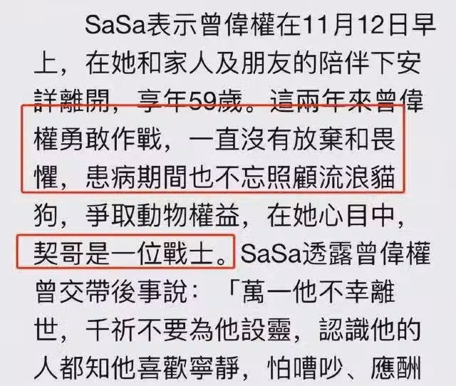 關於曾偉權的後事,也確實尊重了曾偉權的遺願,不設立靈堂。如果是朋友或者影迷想要悼念,那就不如將思念轉化成愛的力量,希望大家可以代替他繼續為流浪動物某權益。