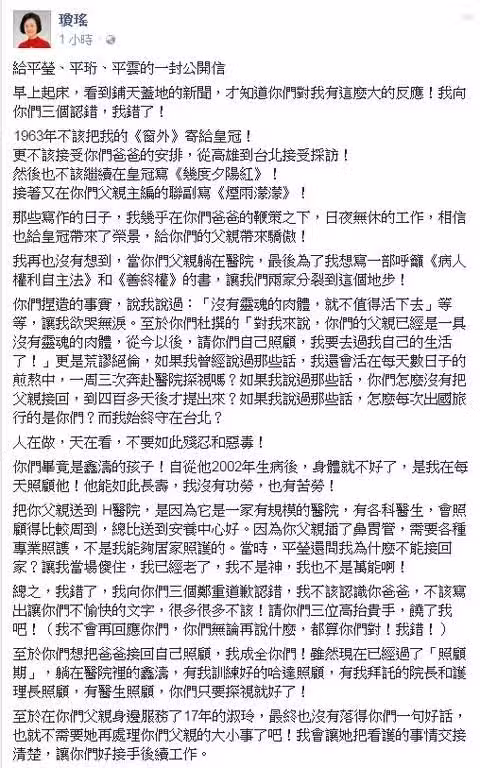 更何況瓊瑤早在2017年就發文向平雲、平珩、平瑩三兄妹道歉。