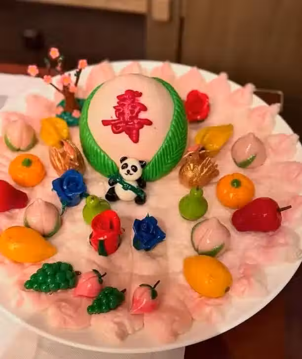 還有一個小熊貓的壽桃蛋糕,蛋糕製作得特別用心,擺盤也是非常可愛。
