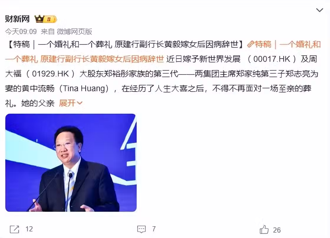12月18日《財新報》報道指出,原建行副行長黃毅去世,他的女兒就是這場婚禮的新娘黃中流暢。